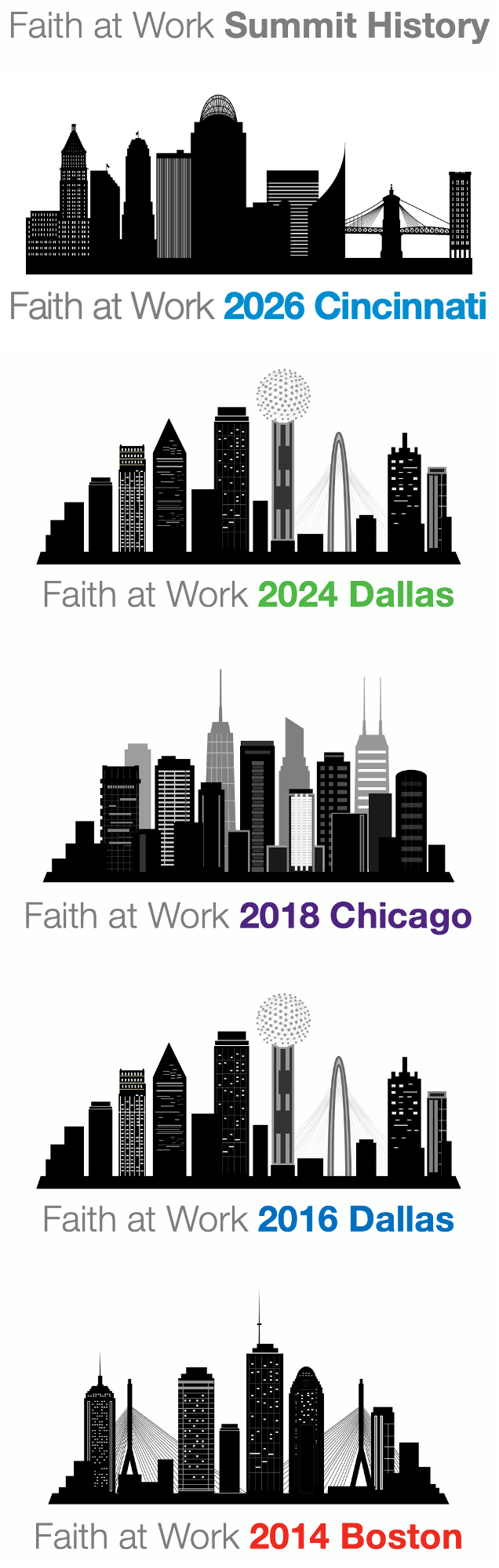 Since then, three additional Faith at Work Summits have been held: Dallas (2016), Chicago (2018), and Dallas again (2024), each continuing the legacy of collaboration and a shared vision to grow the Faith at Work Movement and engage workplace practitioners with church, seminary, university, and workplace ministry leaders.